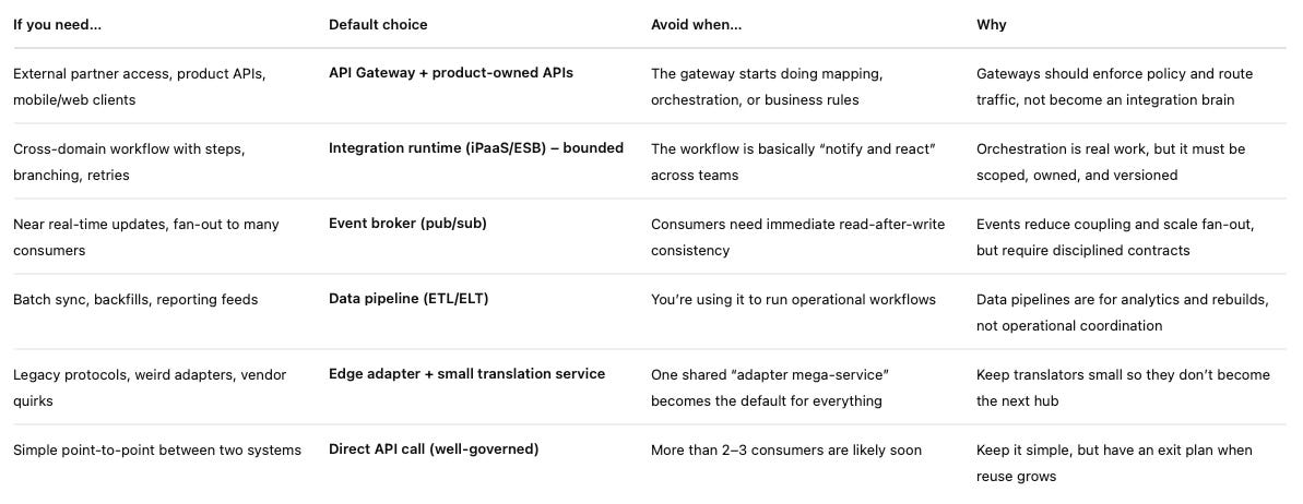 Avoid turning it into a “brain”. If the gateway is doing payload mapping, workflow branching, or domain decisions, it’s no longer a gateway; it’s a brittle integration service with a shiny badge.