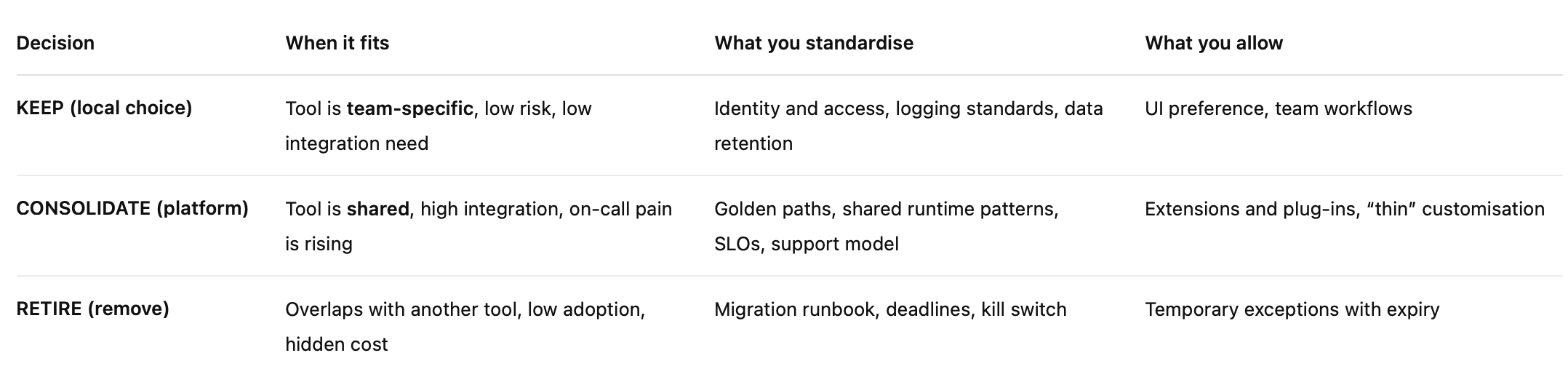 The fastest way to shrink tool sprawl without starting a civil war is to separate standards from preferences. Most teams don’t actually want unlimited choice. They want freedom where it helps delivery and consistency where inconsistency hurts.